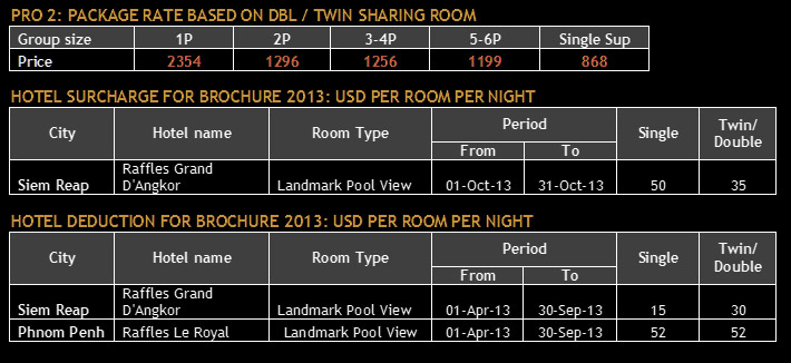 ![]() CAMBODIA (6 DAYS 5 NIGHTS) DAY 1 : SIAM REAP - Arrival Upon your arrival in Siem Reap, transfer to your hotel. Overnight in Siem Reap. Overnight at Raffles Grand D’Angkor hotel in “Landmark Pool View”( www.siemreap.raffles.com) |